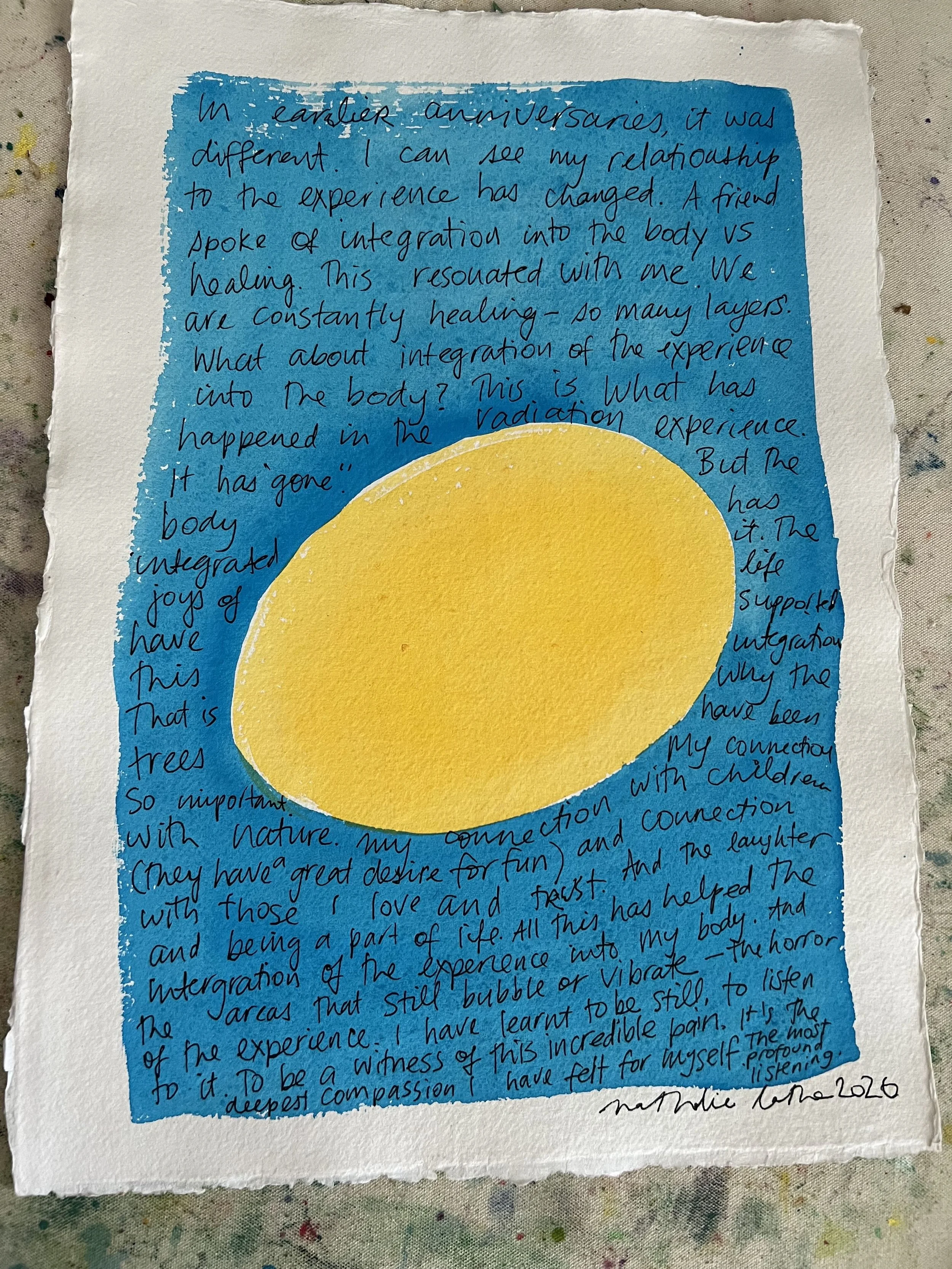 Unknowingly, I returned home, just in time for the anniversary of my radiation treatment. The following night, I could not sleep. Usually, when this happens, I get out of bed and draw onto the paper whatever emotion is inside me. This creates a shift and I am usually able to sleep after that. But this night I chose to stay in the unease of not being able to sleep. What inspired me to do this is the book I have been reading, (The Presence Process, by South African author, Michael Brown) with a small group of friends online. It focuses on a simple, daily meditation of being here, now.